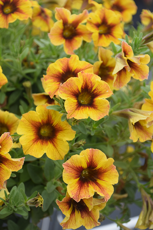 SuperCal® Premium Caramel Yellow Petchoa is blanketed in stunning gold trumpet-shaped flowers with dark red throats and dark red streaks at the ends of the stems from mid spring to late summer. Its pointy leaves remain green in colour throughout the season.