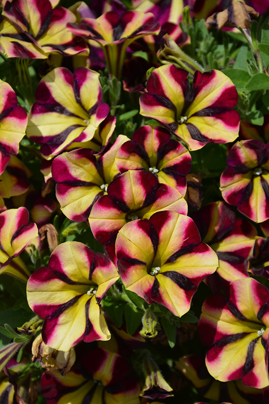 Amore® Fiesta Petunia is clothed in stunning yellow trumpet-shaped flowers with dark red overtones and burgundy stripes at the ends of the stems from mid spring to mid fall. Its tomentose pointy leaves remain green in colour throughout the season.