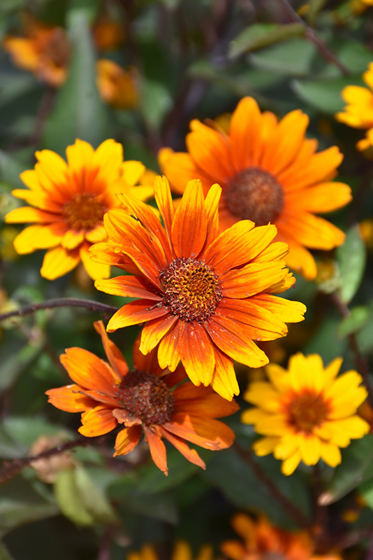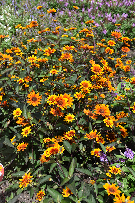Summer Eclipse False Sunflower has masses of beautiful orange daisy flowers with scarlet overtones, coppery-bronze eyes and gold tips at the ends of the stems from early summer to early fall, which are most effective when planted in groupings. The flowers are excellent for cutting. Its attractive serrated narrow leaves remain grayish green in colour with hints of deep purple throughout the season. The dark red stems are very colorful and add to the overall interest of the plant.