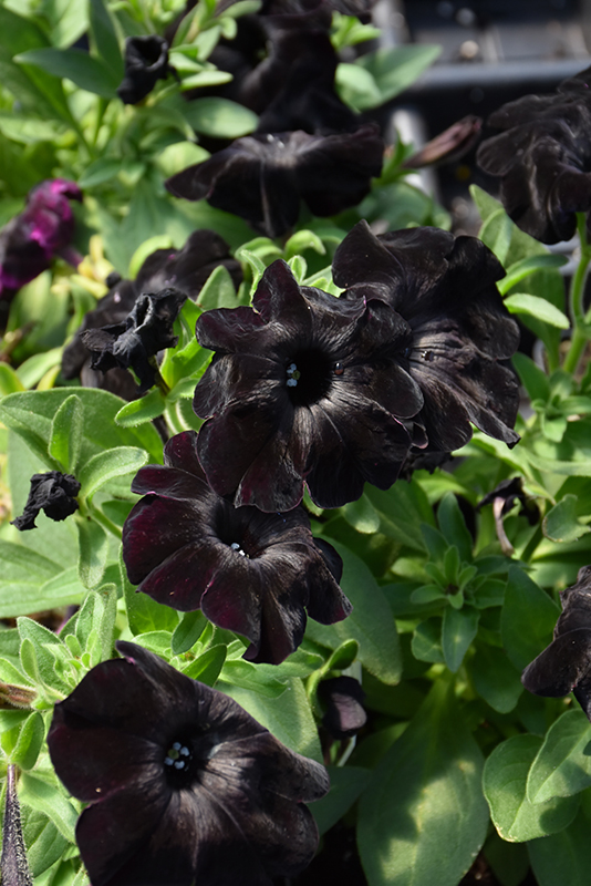 One of the blackest black petunias on the market; controlled, mounded habit with trailing tendencies, perfect for containers and hanging baskets; black trumpeted flowers cascade from medium green foliage; blooms from late spring through summer