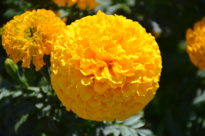 A vigorous, early flowering series, with improved branching and a uniform habit; sturdy stems topped with large, bright gold double blooms stand out against dark green foliage; lovely addition to containers or landscapes; deadhead to encourage new blooms