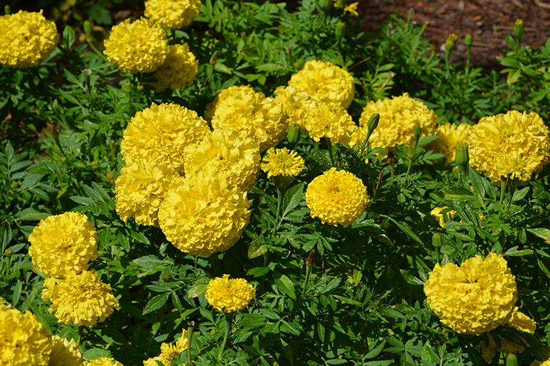 A vigorous, early flowering series, with improved branching and a uniform habit; sturdy stems topped with large, bright yellow double blooms stand out against dark green foliage; perfect for containers or landscapes; deadhead to encourage new blooms
