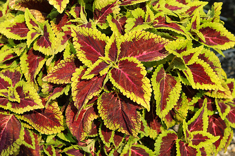 Main Street™ Alligator Alley Coleus' attractive lobed leaves remain burgundy in colour with distinctive light green edges and tinges of red throughout the year on a plant with an upright spreading habit of growth.