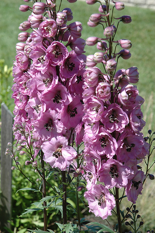 Dusky Maidens Larkspur will grow to be about 3 feet tall at maturity extending to 4 feet tall with the flowers, with a spread of 20 inches. When grown in masses or used as a bedding plant, individual plants should be spaced approximately 14 inches apart. It tends to be leggy, with a typical clearance of 1 foot from the ground, and should be underplanted with lower-growing perennials. The flower stalks can be weak and so it may require staking in exposed sites or excessively rich soils. It grows at a medium rate, and under ideal conditions can be expected to live for approximately 10 years. As an herbaceous perennial, this plant will usually die back to the crown each winter, and will regrow from the base each spring. Be careful not to disturb the crown in late winter when it may not be readily seen!