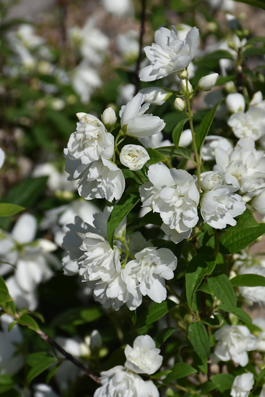 Snow Dwarf Mockorange is clothed in stunning clusters of fragrant double white flowers at the ends of the branches in late spring. It has dark green deciduous foliage. The serrated oval leaves do not develop any appreciable fall colour.